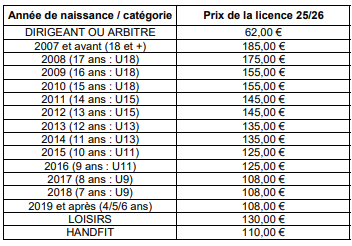 Tarifs 2025/26 :